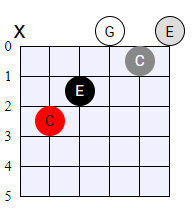 open snaren speelt, kom je de noten C, E en G vaker tegen, en daardoor kan het akkoord over vijf snaren worden gespeeld.