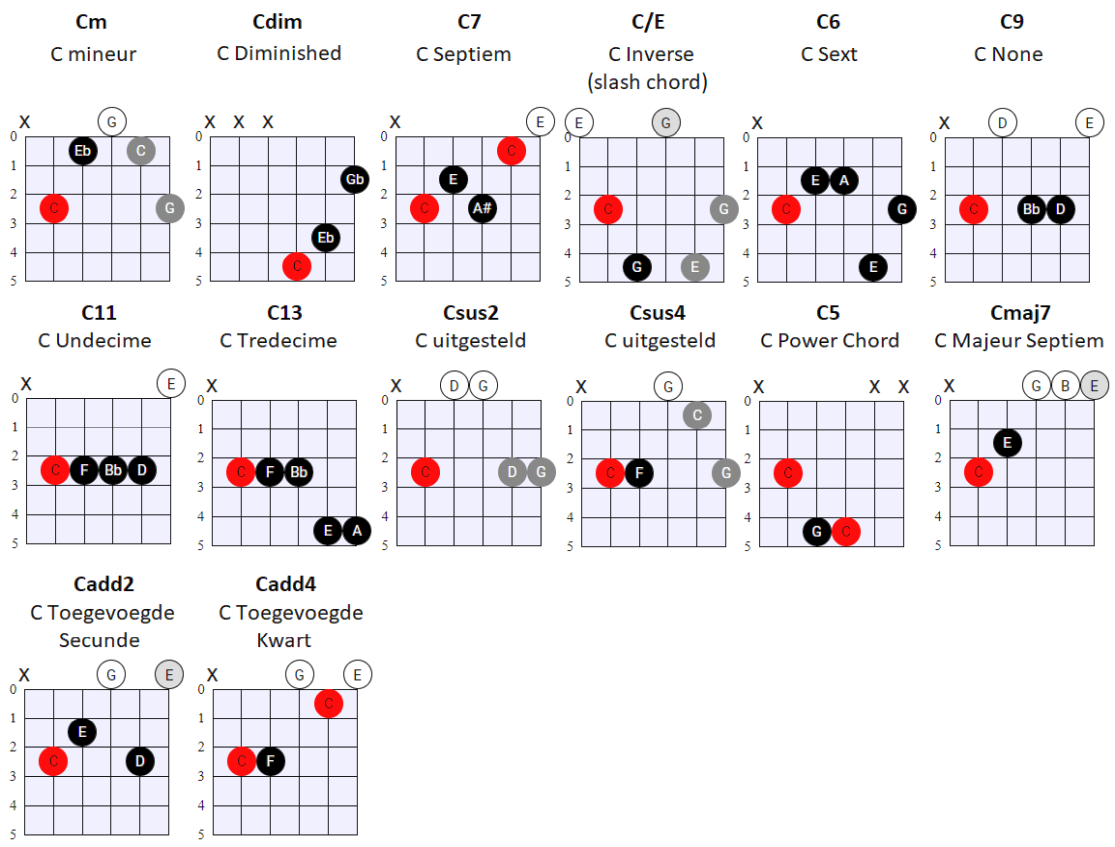 majeur akkoord. Hieronder zie je een overzicht van enkele verschillende akkoordvormen voor het C akkoord. We geven je de
