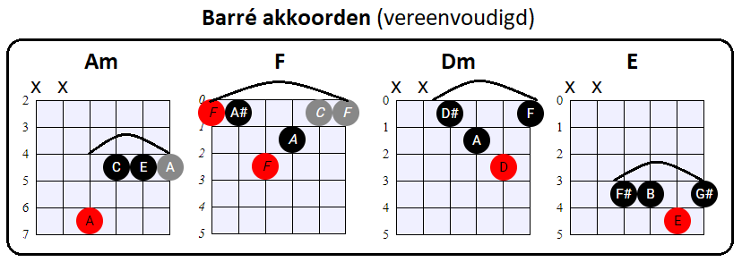Ten aanzien van de akkoorden die we voorstellen om de song te spelen, gebruiken we alternatieve barré akkoorden die eenvoudiger te