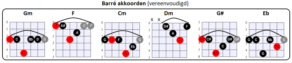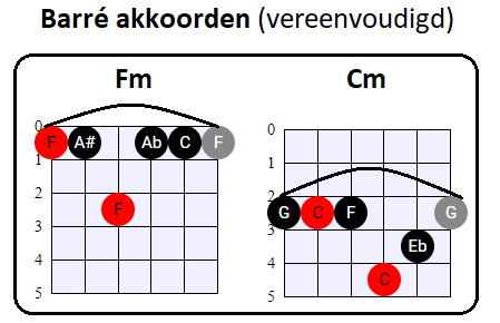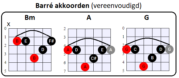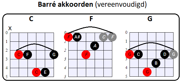 vooral de tonen op de G, B en (hoge) E snaar voor zijn rekening neemt. En dat is nou net wat wij met de vereenvoudigde Barré akkoorden