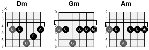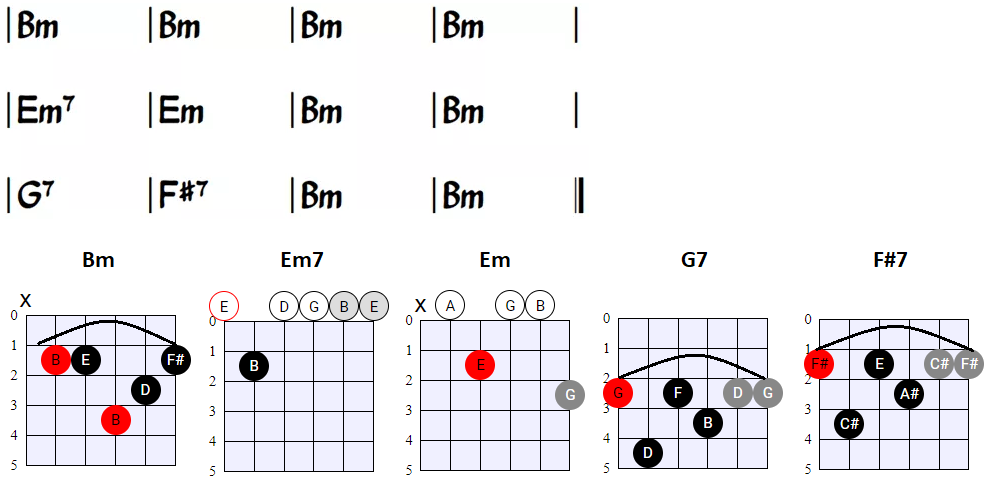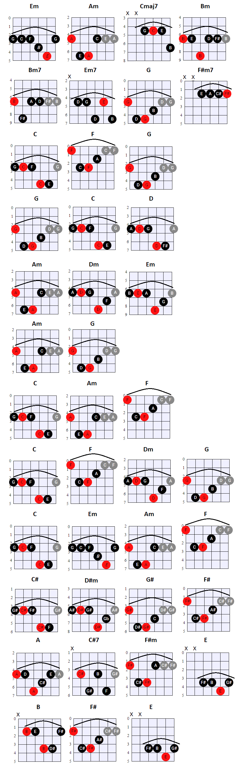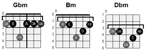 in één barré Shape te spelen zijn, simpel speelbaar. Daarna speel je vooral in B mineur, met een klein uitstapje naar F♯ en E mineur.