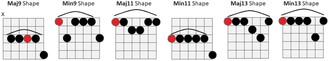 Andere Shapes die je kunt gebruiken vind je in onderstaande afbeelding, waarbij we de grondtoon (root note) in een rode kleur weergeven, zodat