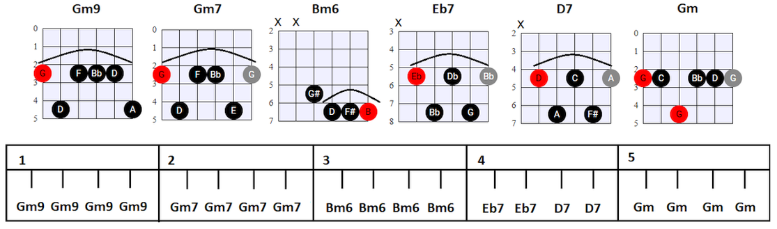 Om het jazz verhaal af te ronden vind je onderstaand een akkoordprogressie in G mineur, in een jazzy stijl. Ook hierin zie je dat met relatief