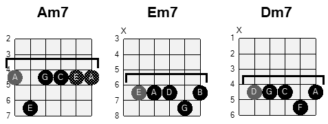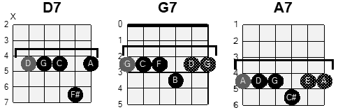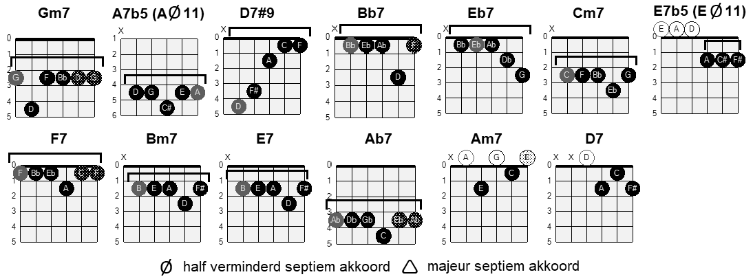 Hieronder de genoemde septiemakkoorden in de open en de barré versie: