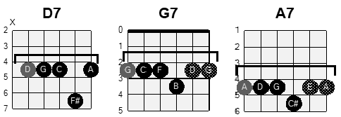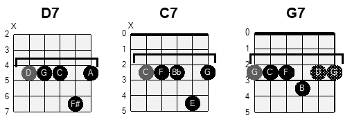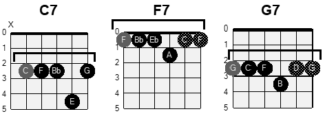 Blues wordt veel gespeeld over septiem (7) akkoorden, en de belangrijkste daarvan zijn de C7, A7, G7, E7 en D7. Niet vreemd, deze volgorde