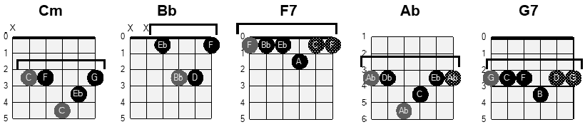 hebben we in een aantal stijlsoorten en toonsoorten een aantal voorbeeld-akoordenprogressies bedacht. De akkoorden zijn voornamelijk in barré-vorm,