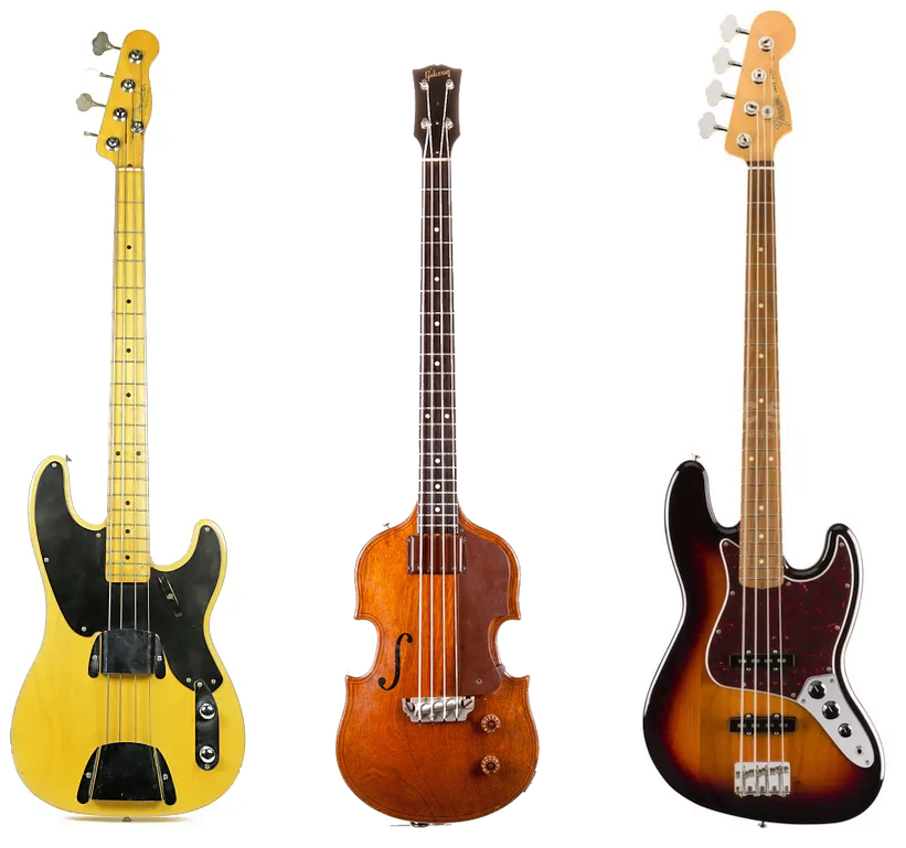Je ziet hierboven van links naar rechts een Fender Precision Bass uit 1951, een Gibson EB1 Violin Bass uit 1956, en een Fender