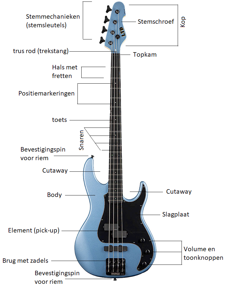 De basgitaar is een horizontaal bespeeld instrument, gestemd als een contrabas met meestal een massieve body en met elementen