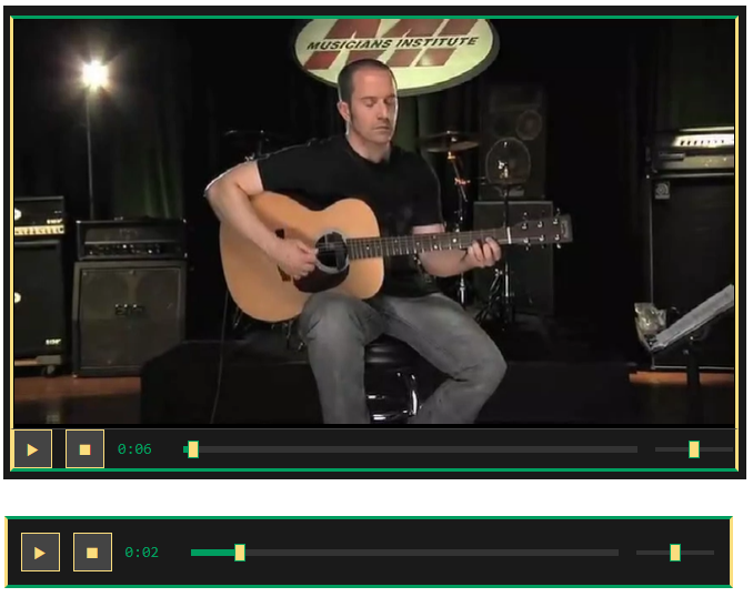 De A/V (audio/video) functie geeft gelegenheid om externe media-bestanden in de "MuzicK" applicatie af te spelen.Door op de button te klikken wordt een navigatievenster geopend, en kan de gebruiker een extern media bestand openenen, om dit direct in de applicatie te gebruiken. Audio formaten die gebruikt kunnen worden: .mp3, .mp4, .ogg, gjdm Video formaten die gebruikt kunnen worden: .mp4, .webm, gjdv Afbeeldingsformaten als .gif, .png, .jpg, gjdi Voor videomedia (zie de afbeelding hiernaast), opent zich een videovenster waar je de bekende browser-georiënteerde besturingselementen ziet. Voor audiomedia wordt er een afspeelelement getoond, ook weer met de bekende buttons voor start/pause, stop, een slider en volume controle. Deze hulpfunctie kan alleen worden gestart als er geen andere applicaties in "MuzicK" actief zijn. | |