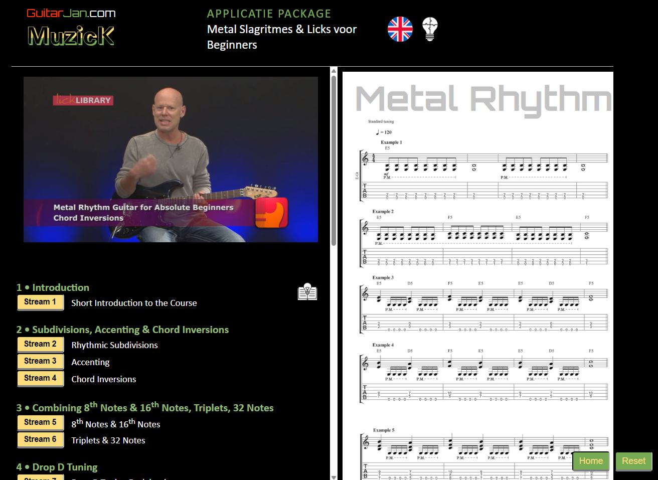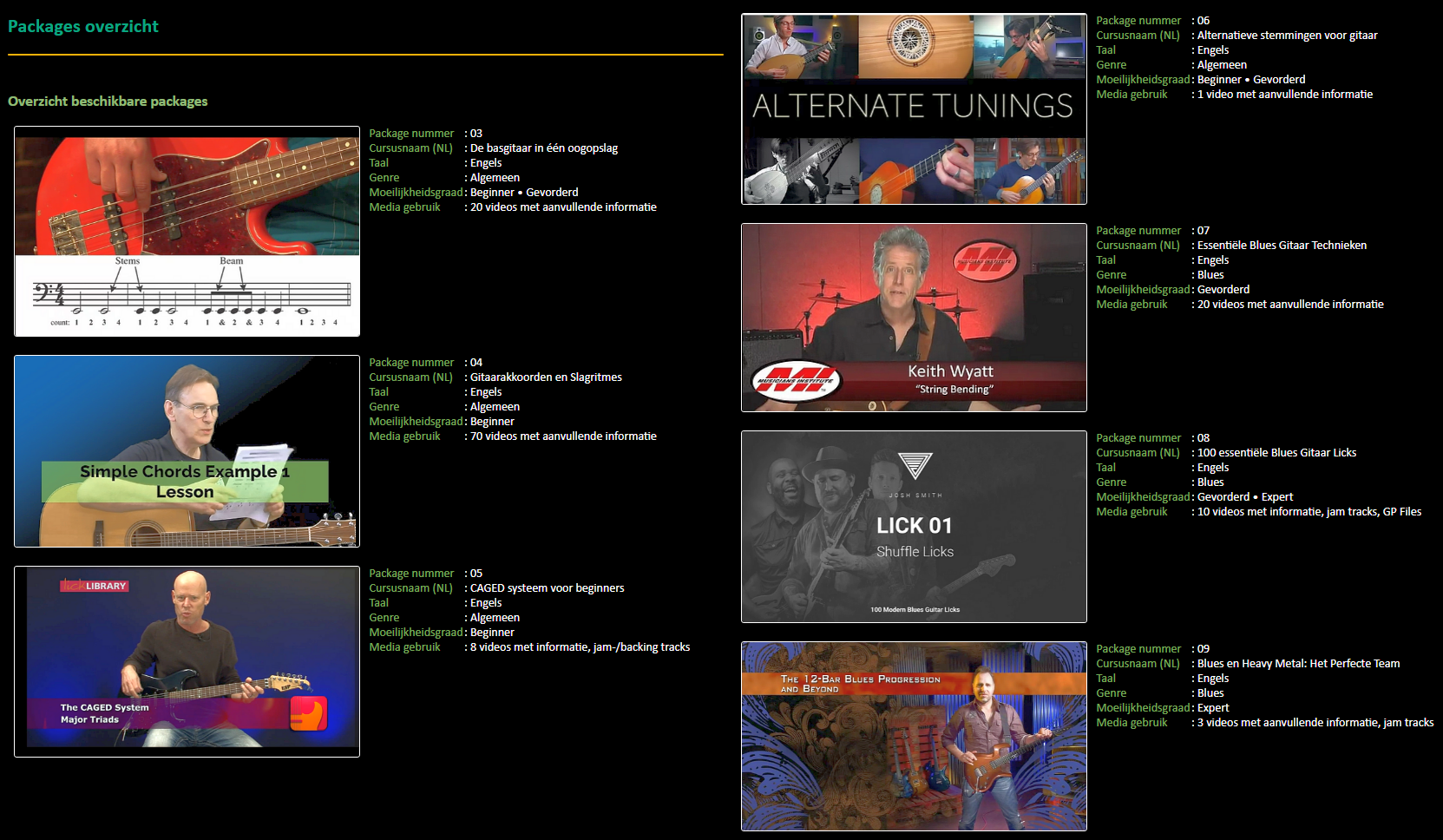 5 | Theoriemodule voor de electrische gitaar, twee praktijkgerichte oefensessies, vier specifieke genre gebaseerde solo- en samen spelen blokken (video-media), en twee blokken solo spelen leren (genres funk, jazz & latin rock). Deze twee blokken hebben tientallen jamtracks ter ondersteuning. | |