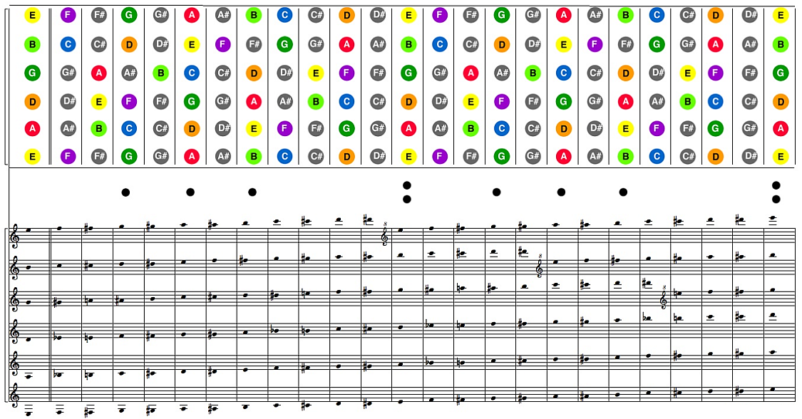 De puntjes die je tussen de gitaarhals en de notenbalk getekend ziet, representeren de positiepunten op de hals van de gitaar.