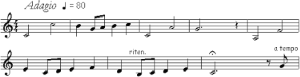 De aanduiding "Adagio ♩ = 80" betekent dat het muziekstuk een "Adagio" tempo heeft (langzaam en comfortabel gespeeld