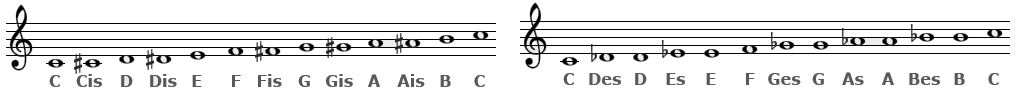 We kunnen nu alle opeenvolgende noten vanaf de C opschrijven, hetzij met kruizen, hetzij met mollen: