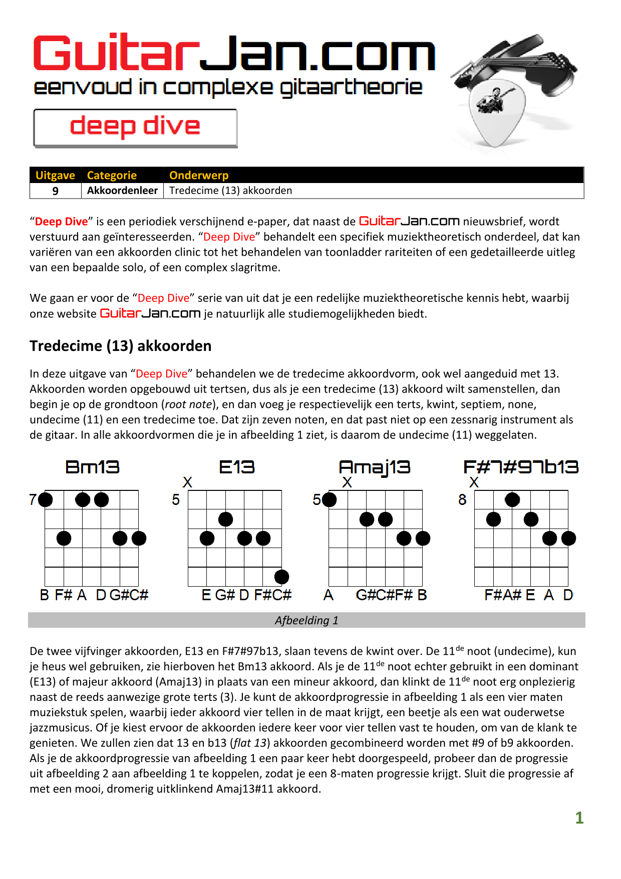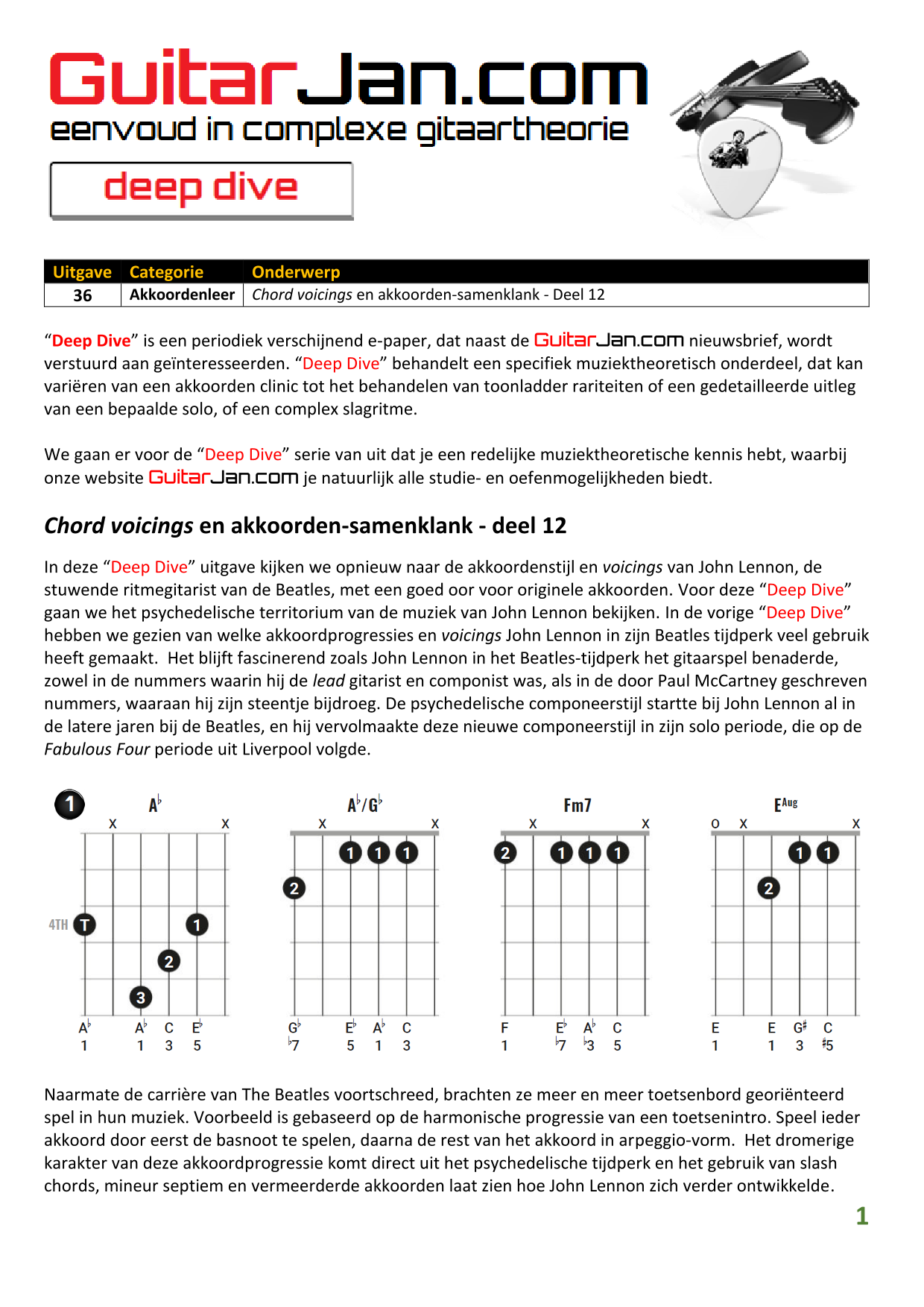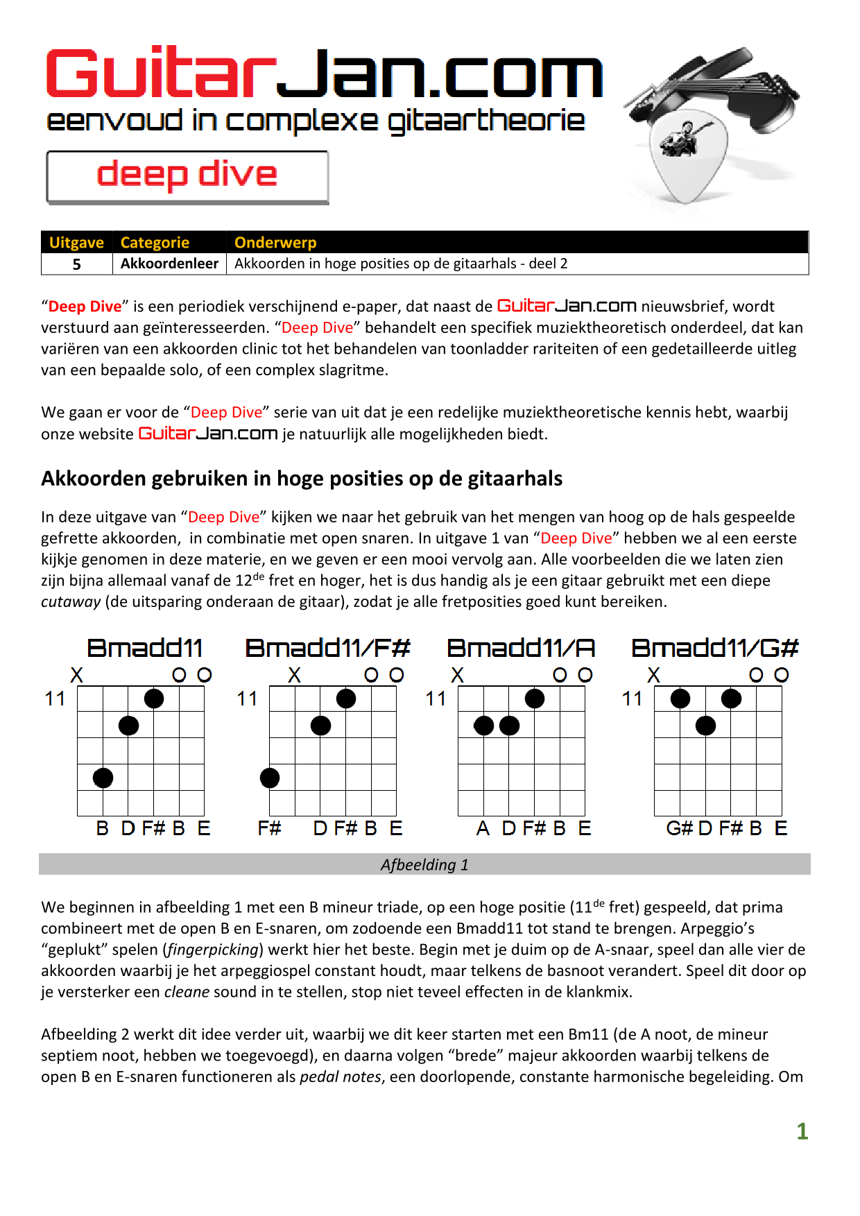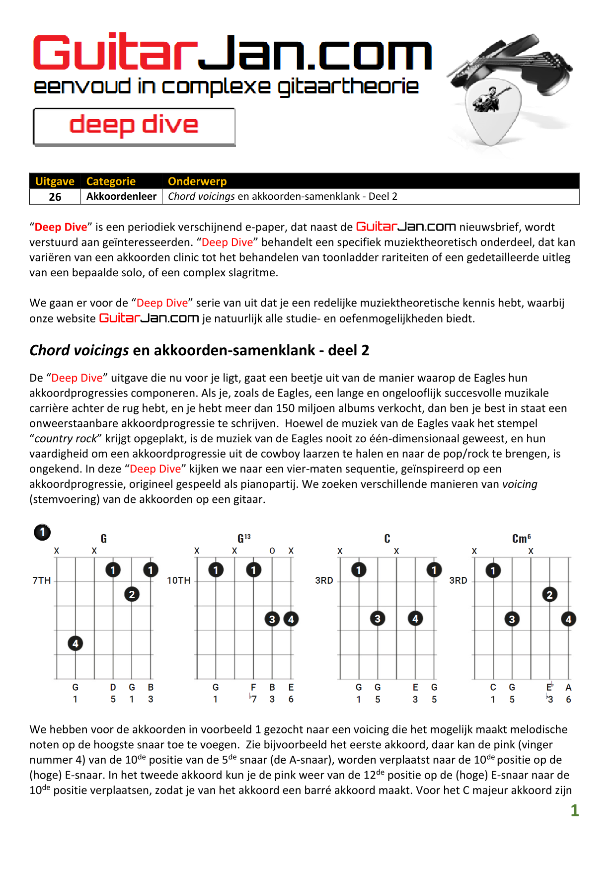 01 Akkoorden in hoge posities - Deel 1 02 Vermeerderde (augmented) akkoorden 03 Verminderde (diminished) septiemakkoorden 04 Twee-vinger akkoorden 05 Akkoorden in hoge posities - Deel 2 06 None (9) en undecime (11) akkoorden 07 Uitgestelde (suspended) akkoorden 08 7#5 (aug) akkoorden 09 Tredecime (13) akkoorden 10 Funky stemvoering 11 alternatieve Blues stemvoering 12 Verschuifbare akkoordvormen (Shapes) 13 Modale toonladderstructuren 14 Uitbreiden van akkoordprogressies