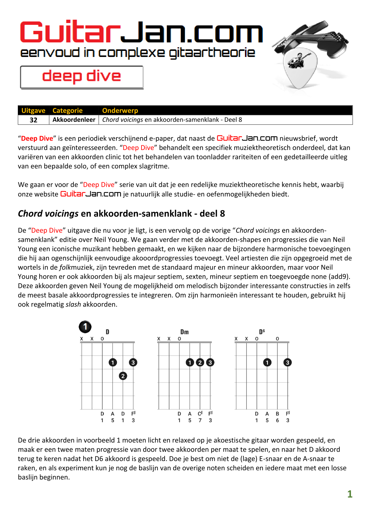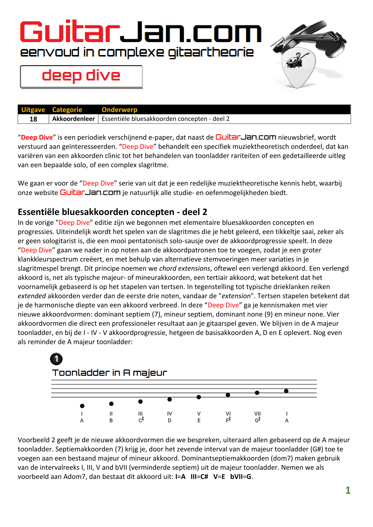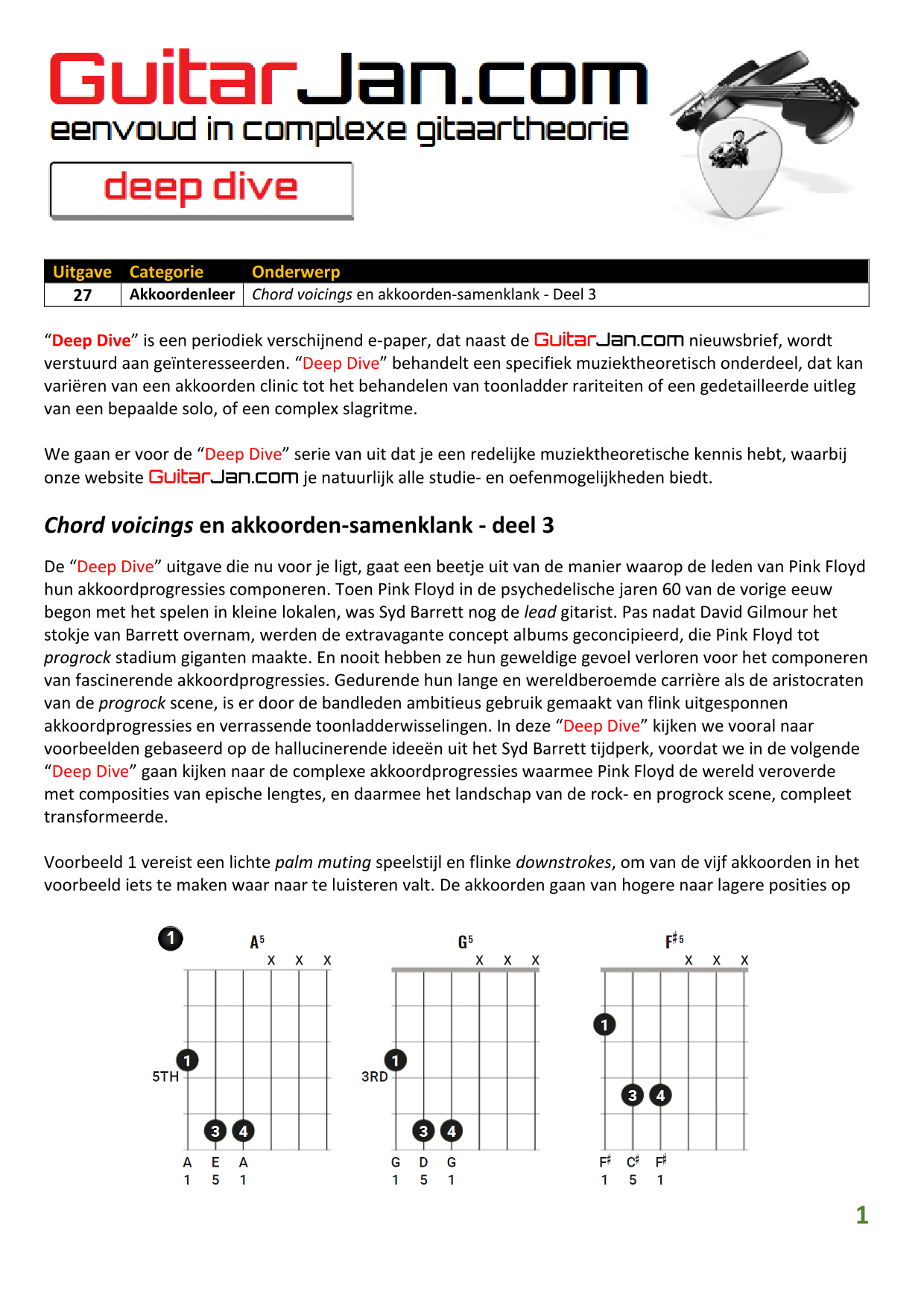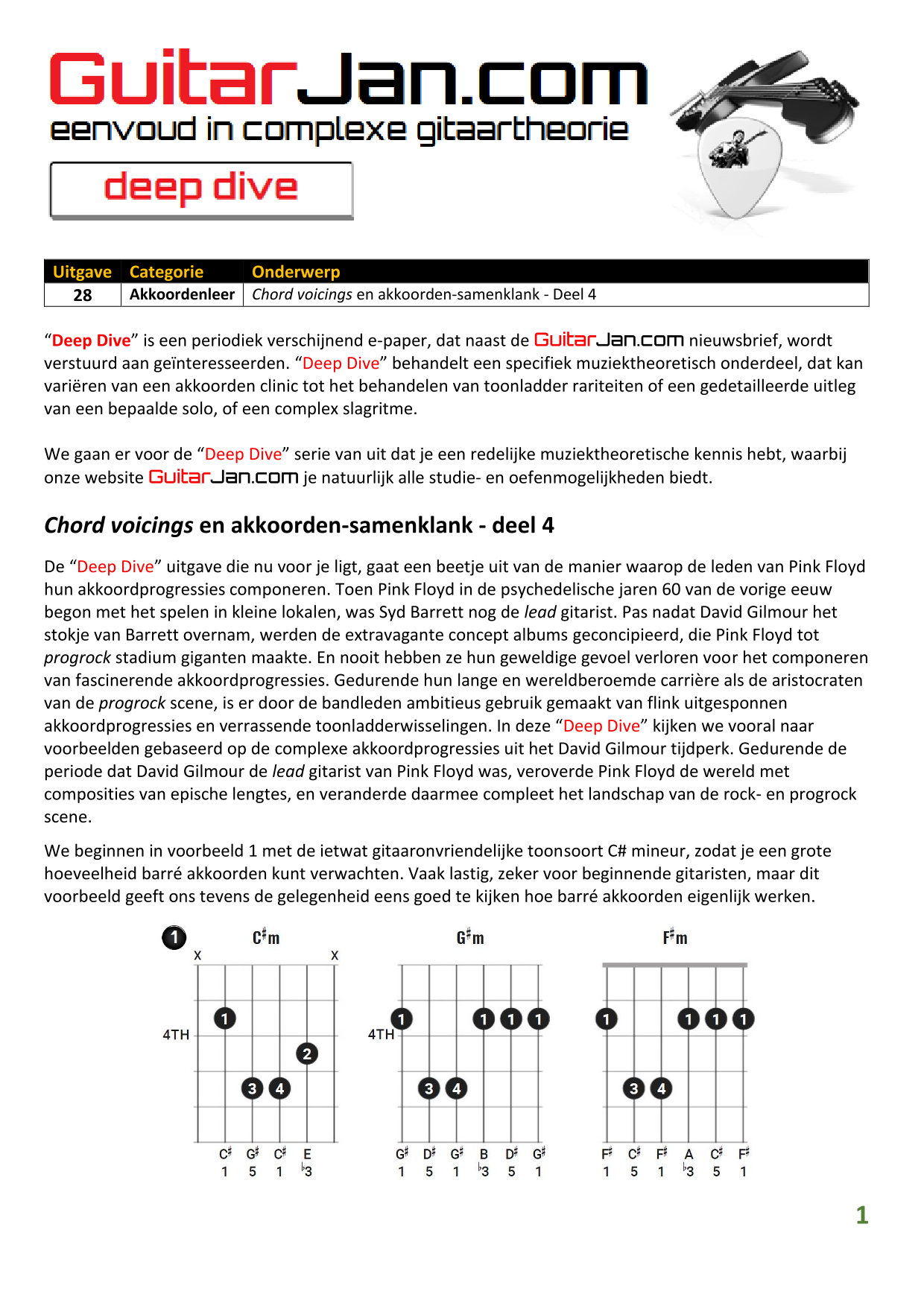 01 Akkoorden in hoge posities - Deel 1 02 Vermeerderde (augmented) akkoorden 03 Verminderde (diminished) septiemakkoorden 04 Twee-vinger akkoorden 05 Akkoorden in hoge posities - Deel 2 06 None (9) en undecime (11) akkoorden 07 Uitgestelde (suspended) akkoorden 08 7#5 (aug) akkoorden 09 Tredecime (13) akkoorden 10 Funky stemvoering 11 alternatieve Blues stemvoering 12 Verschuifbare akkoordvormen (Shapes) 13 Modale toonladderstructuren 14 Uitbreiden van akkoordprogressies