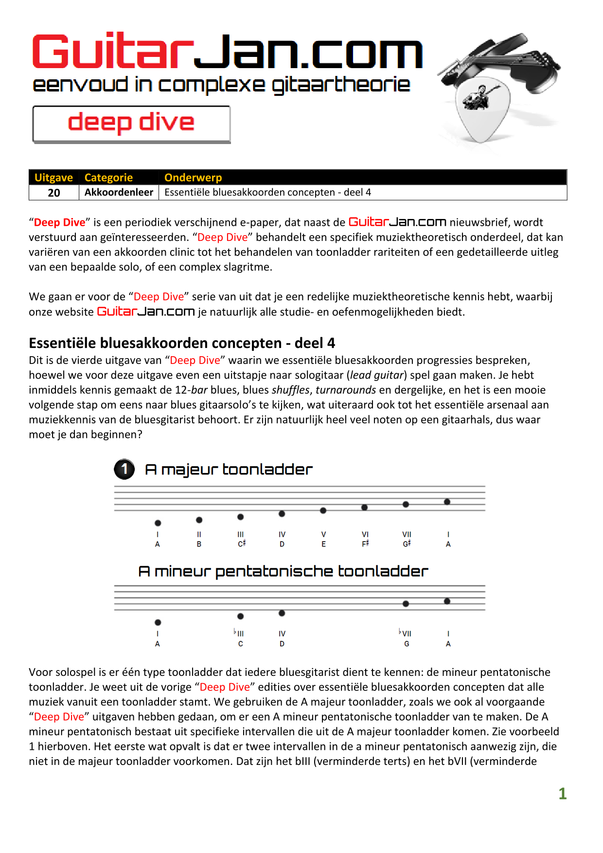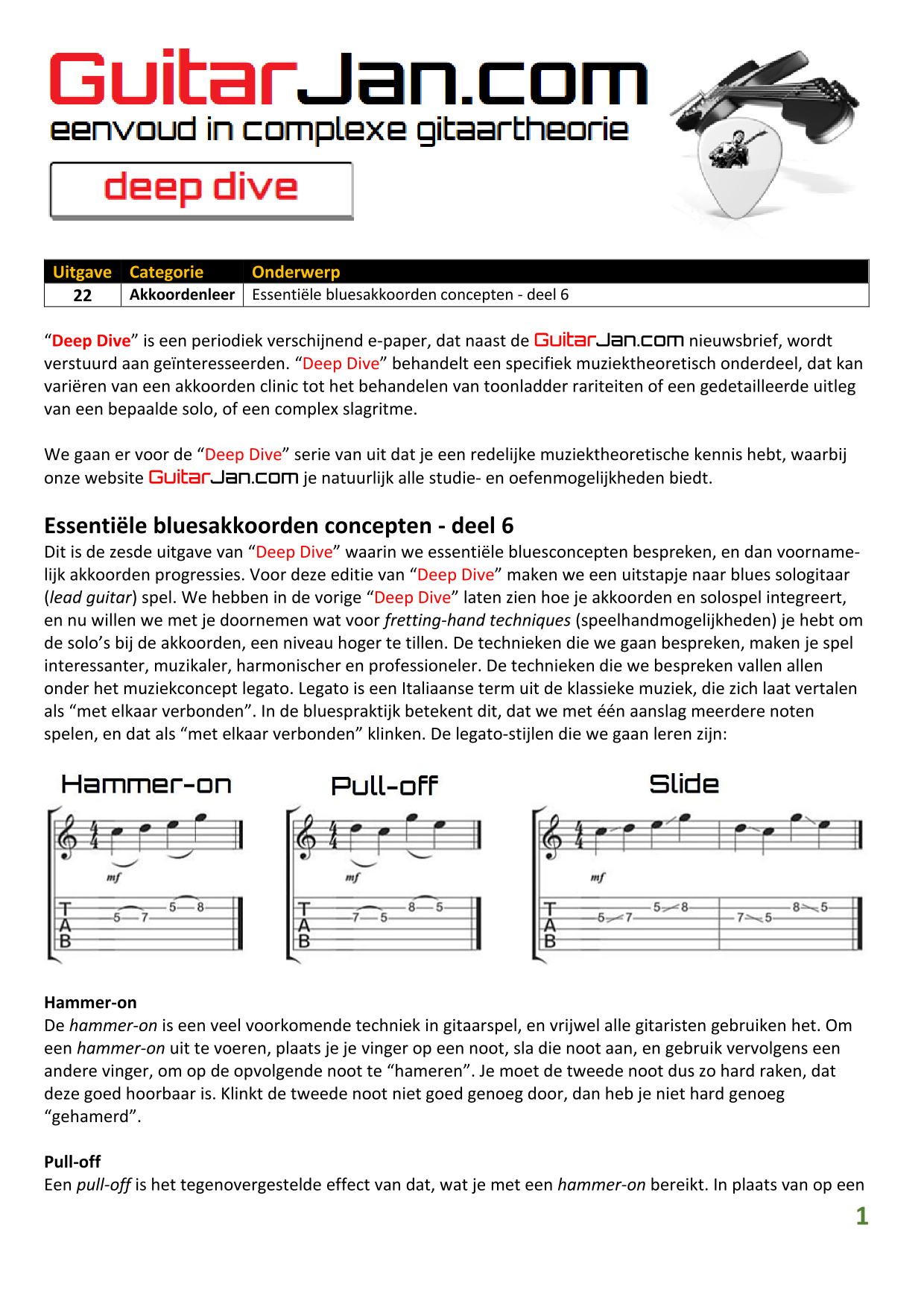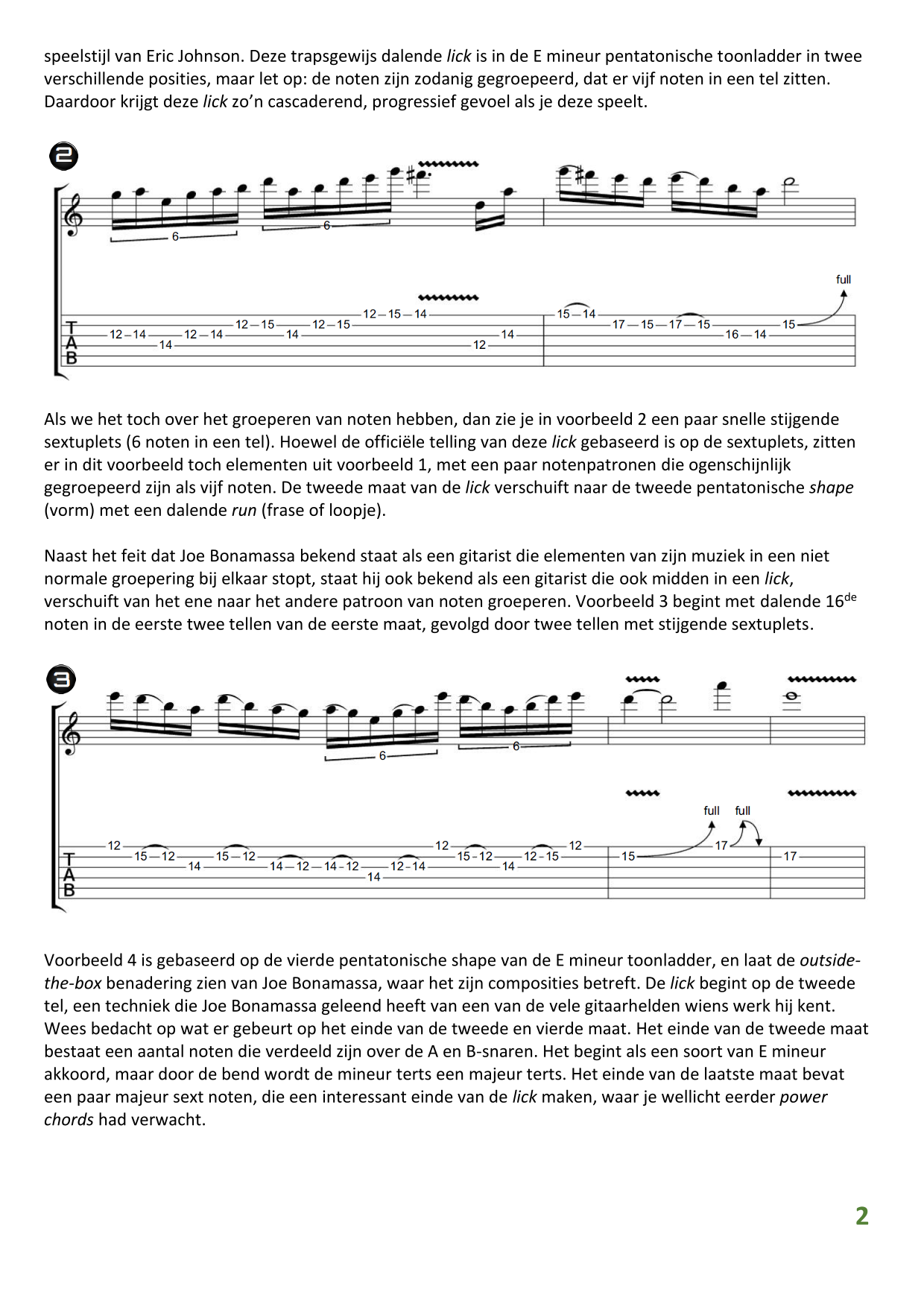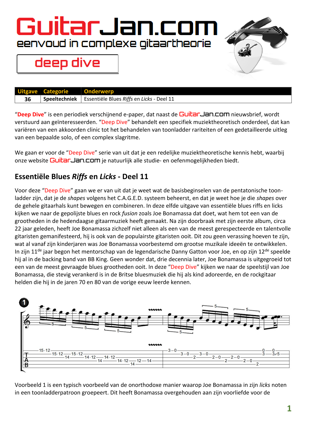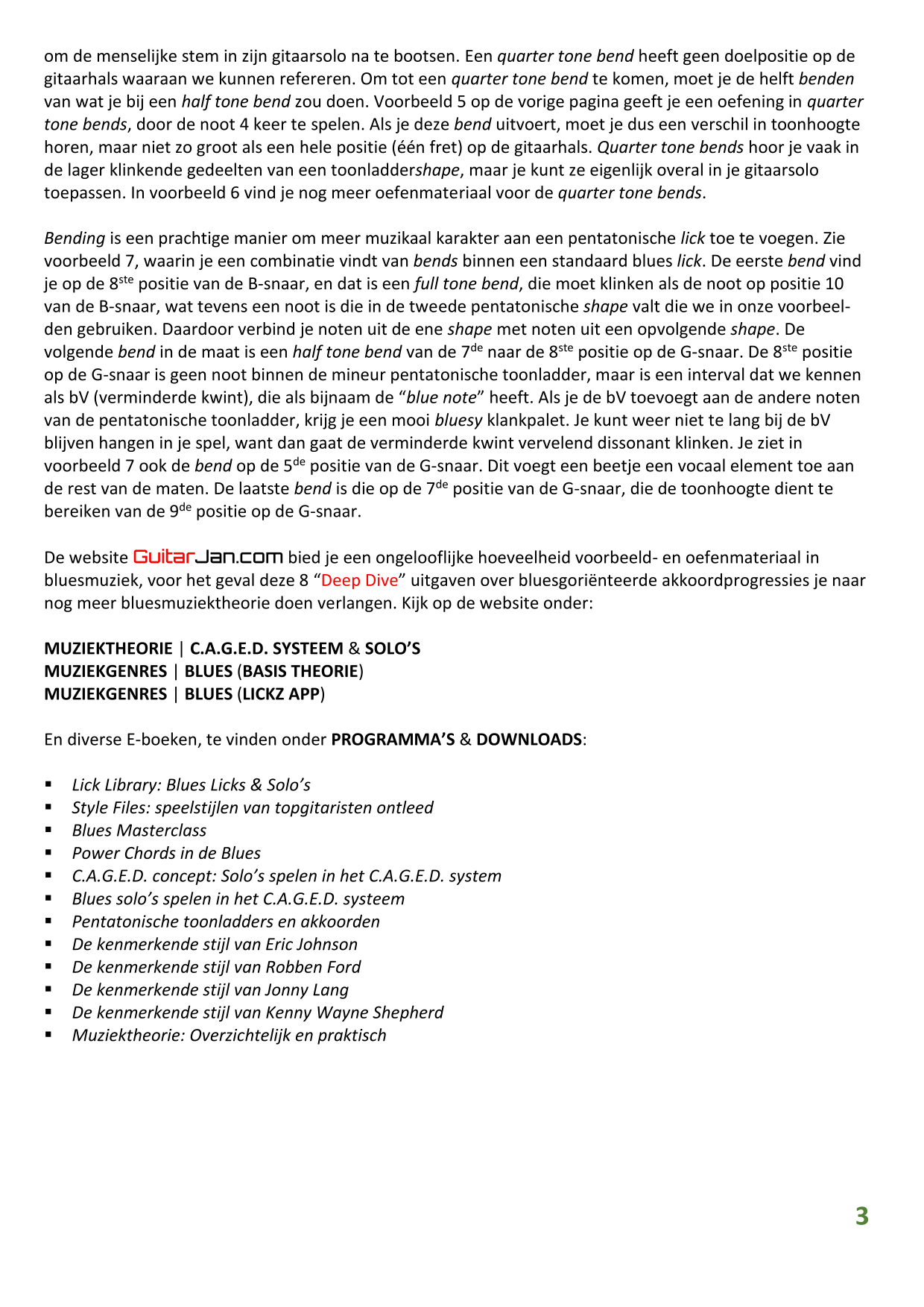 01 leren van andere instrumenten 02 Introductie in Sweep Picking 03 Bluessolo'S gebaseerd op riffs 04 Licks met vier vingers 05 Symmetrisch gebruik van notenpatronen 06 Orgelpunt (pedal point) licks 07 C.A.G.E.D. en 3NPS gecombineerd 08 Pentatonische substituties 09 Pentatonische improvisatie 10 Arpeggio's verfraaien 11 Mixolydische modus en de mineur terts 12 Stijlvolle bluessolo's 13 Tonale perfectie (pitch) 14 Het spelen van harmonische toonladders 15 Improvisatie over arpeggio's 16 Melodisch mineur en de mineur II-V7 progressie 17 Licks in shredded metal stijl 18 Oefenen zonder effecten 19 Old School blues intro 20 Diatonische arpeggio's 21 Improviseren met omkeringen 22 Solo's meer spanning geven 23 De Mixolydische toonladder en de kleine terts 24 Blues ritme combineren met basic licks 25 De A en G-Shapes in de mineur pent. toonladder 26 Essentiële blues Riffs en Licks - Deel 1 27 Essentiële blues Riffs en Licks - Deel 2 28 Essentiële blues Riffs en Licks - Deel 3 29 Essentiële blues Riffs en Licks - Deel 4 30 Essentiële blues Riffs en Licks - Deel 5