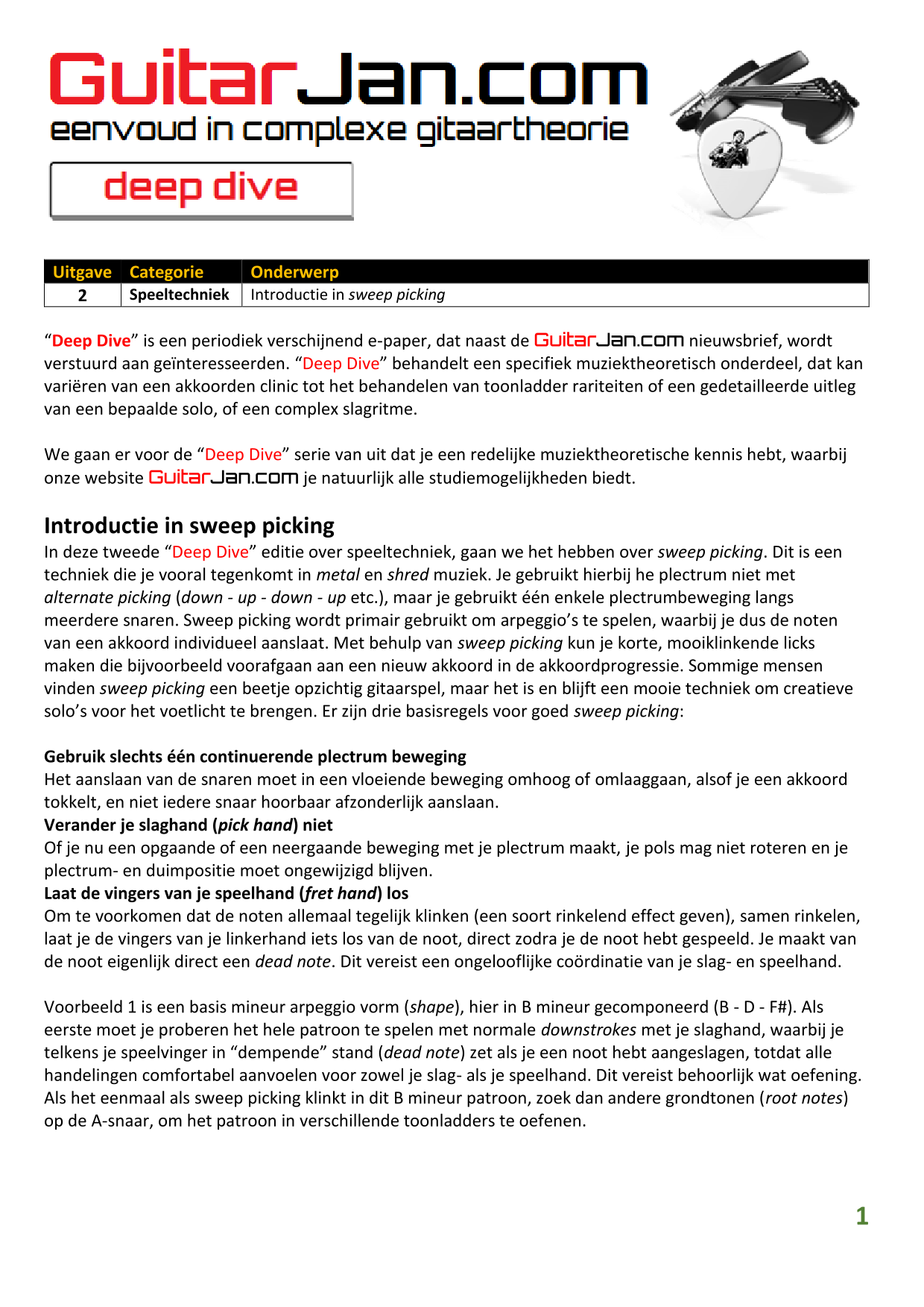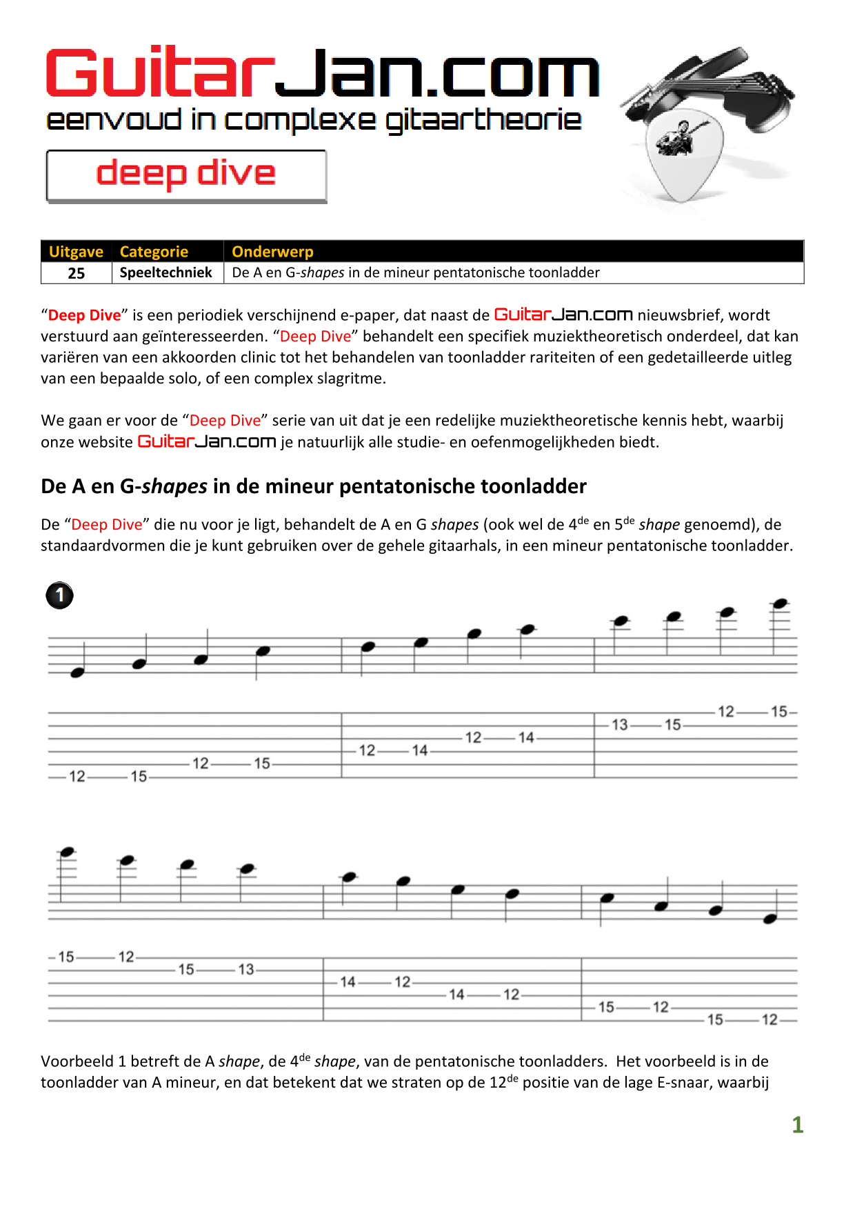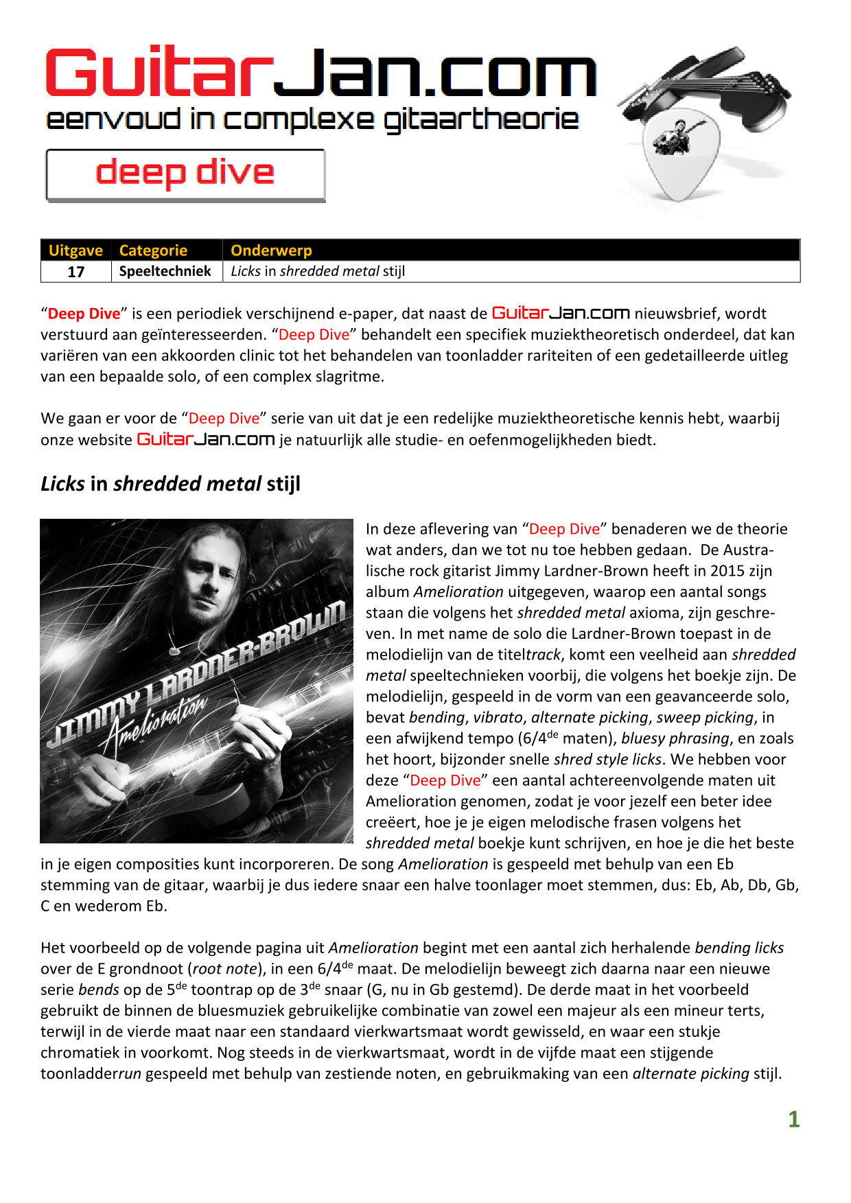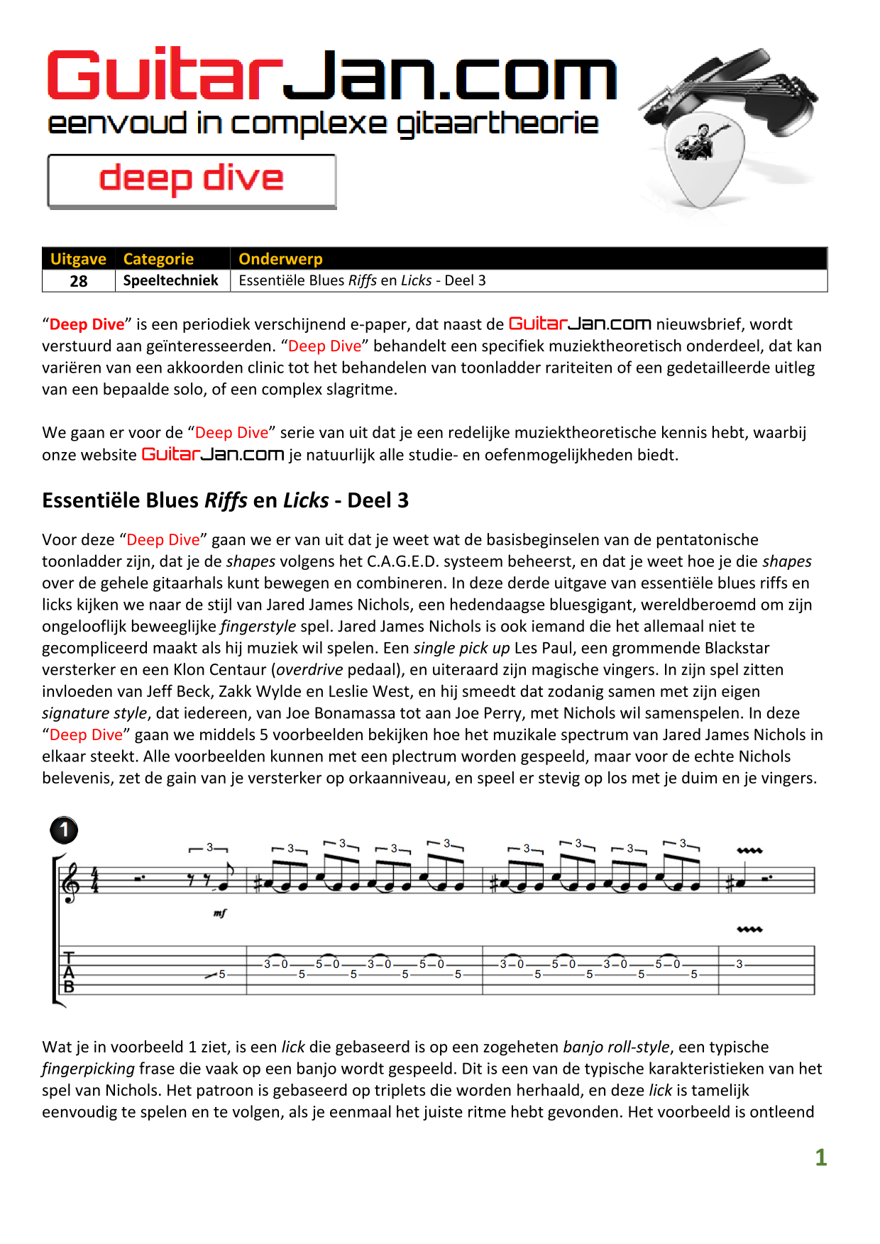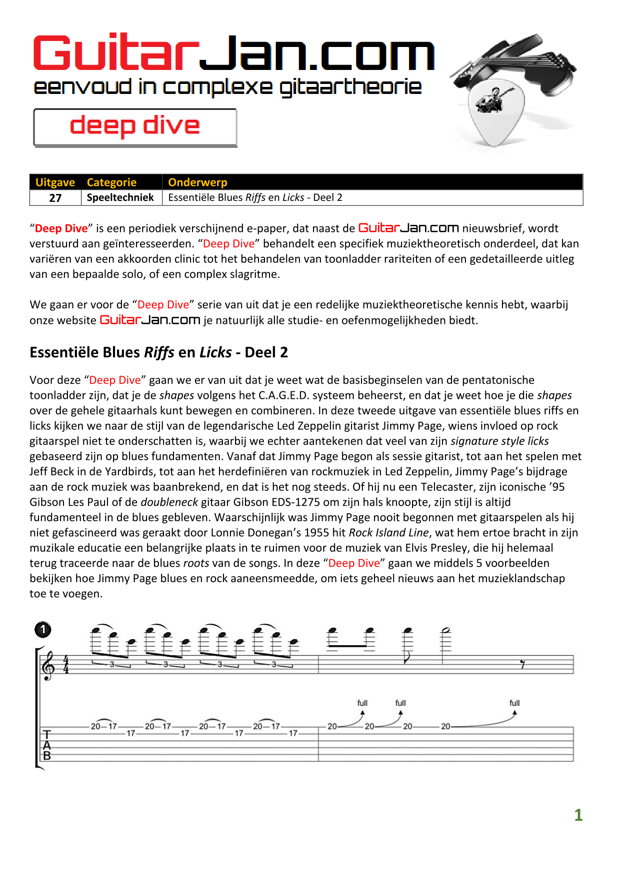 01 leren van andere instrumenten 02 Introductie in Sweep Picking 03 Bluessolo'S gebaseerd op riffs 04 Licks met vier vingers 05 Symmetrisch gebruik van notenpatronen 06 Orgelpunt (pedal point) licks 07 C.A.G.E.D. en 3NPS gecombineerd 08 Pentatonische substituties 09 Pentatonische improvisatie 10 Arpeggio's verfraaien 11 Mixolydische modus en de mineur terts 12 Stijlvolle bluessolo's 13 Tonale perfectie (pitch) 14 Het spelen van harmonische toonladders 15 Improvisatie over arpeggio's 16 Melodisch mineur en de mineur II-V7 progressie 17 Licks in shredded metal stijl 18 Oefenen zonder effecten 19 Old School blues intro 20 Diatonische arpeggio's 21 Improviseren met omkeringen 22 Solo's meer spanning geven 23 De Mixolydische toonladder en de kleine terts 24 Blues ritme combineren met basic licks 25 De A en G-Shapes in de mineur pent. toonladder 26 Essentiële blues Riffs en Licks - Deel 1 27 Essentiële blues Riffs en Licks - Deel 2 28 Essentiële blues Riffs en Licks - Deel 3 29 Essentiële blues Riffs en Licks - Deel 4 30 Essentiële blues Riffs en Licks - Deel 5