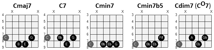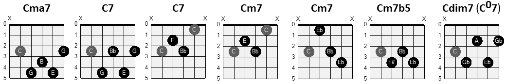 het onthouden van akkoordvormen, en het leert je begrijpen wat het relationele kader tussen akkoorden is. Je ziet, dat het Majeur 7 en het 7 akkoord slechts