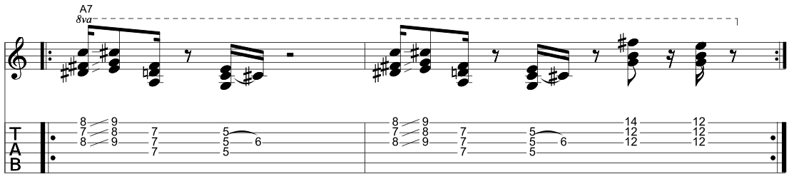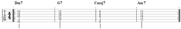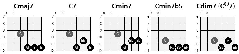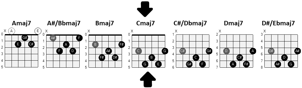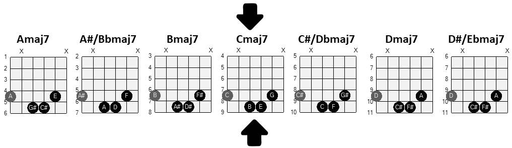 We transponeren het Cmaj7 akkoord met de grondtoon op de 6de snaar, de lage-E snaar, naar een drietal posities terug, en vooruit op de