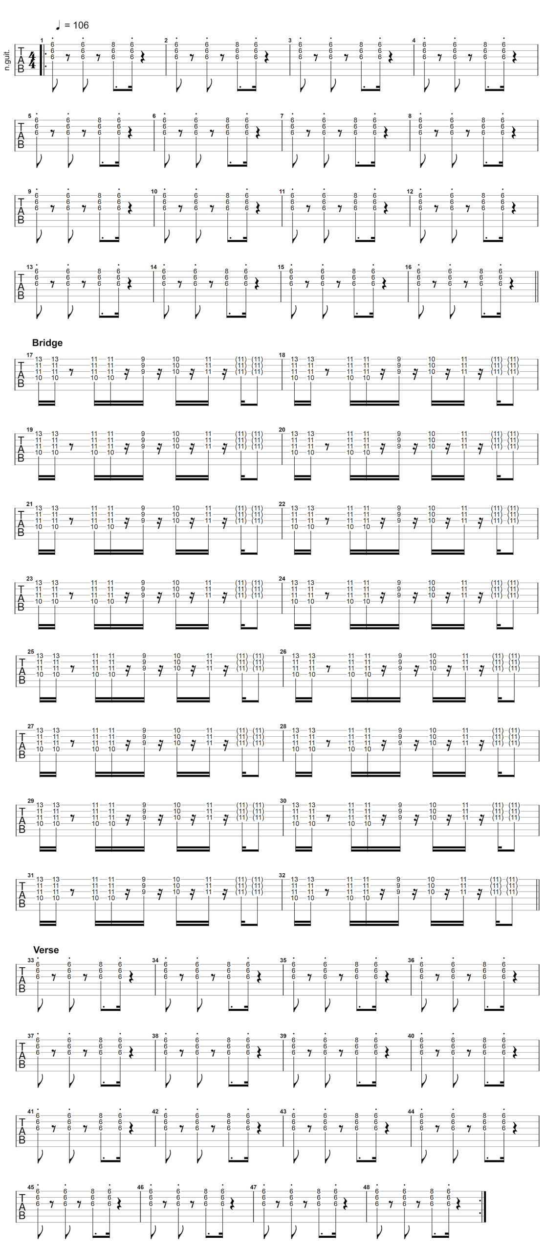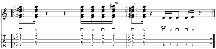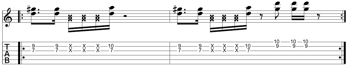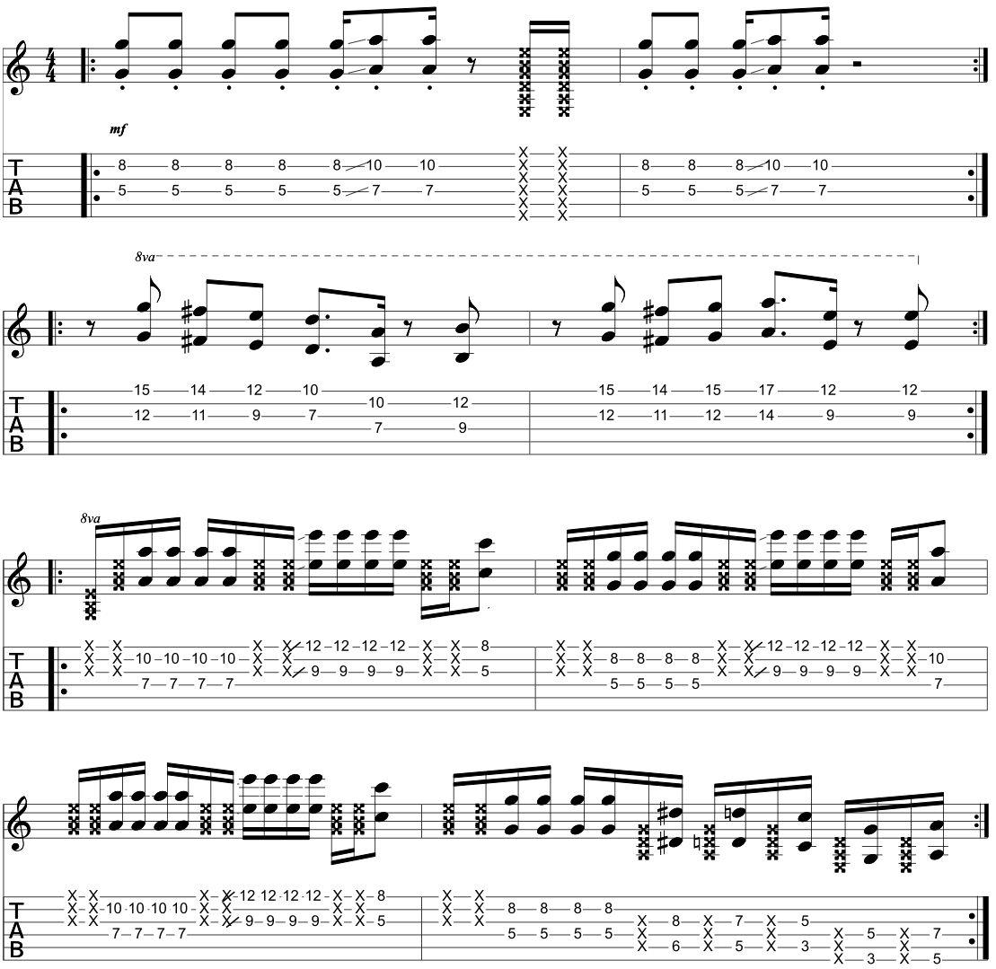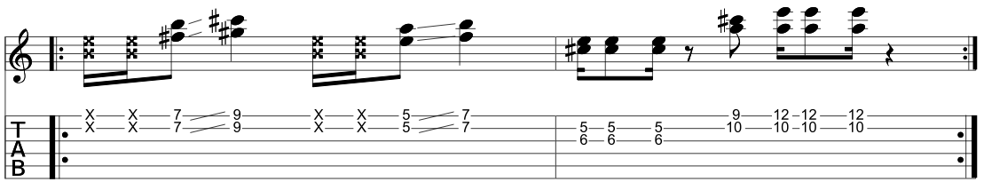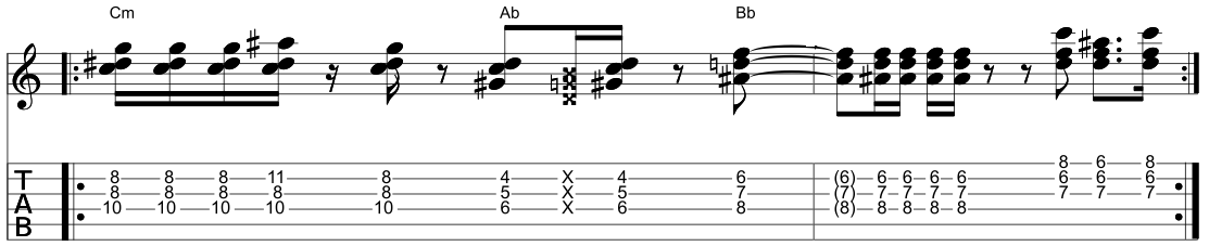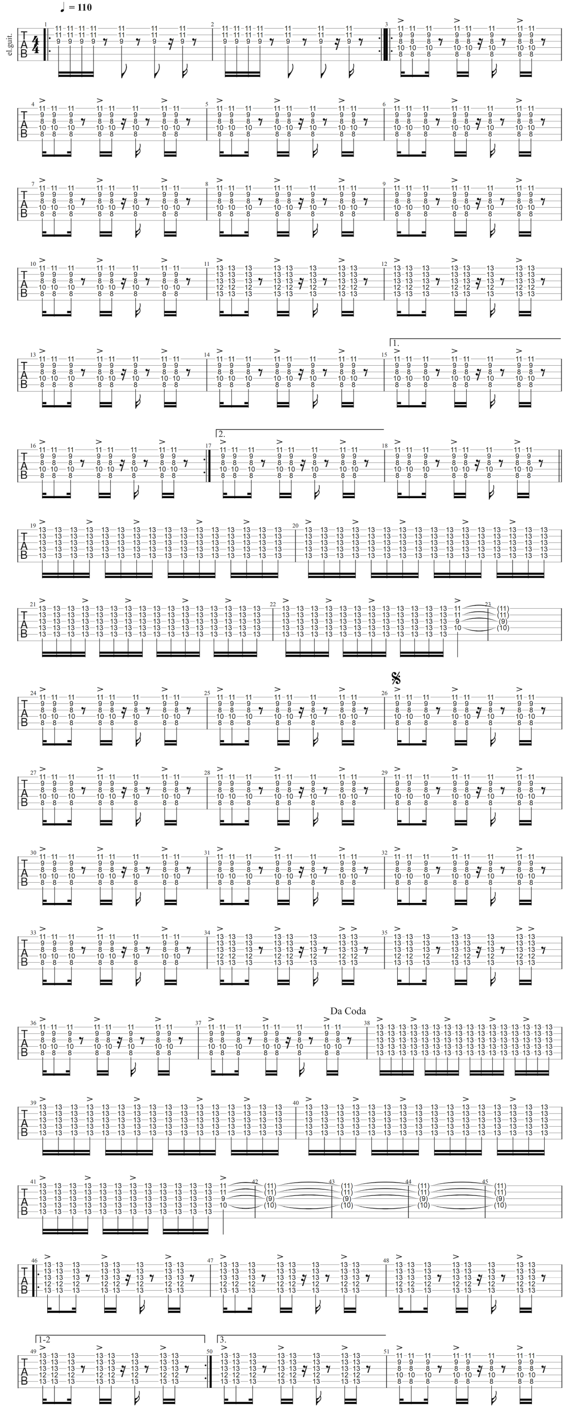 verdeeld is in ritmes van 16de noten. Dat wordt versterkt door accenten en "riffs" (ritmisch loopje) die de andere instrumenten als elektrische
