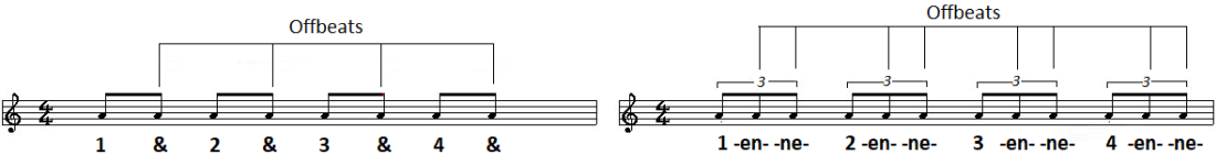 We hebben het al gezegd: Reggae wordt gespeeld op de offbeat in een maat. Kijk eens naar de linkerafbeelding hierboven.