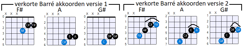 Of, in verkorte versie 2, blijven het drie-vinger akkoorden, doordat je een verkorte (verkleinde) Barré maakt over de noten op de