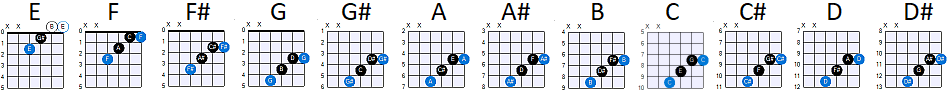 akkoorden te spelen. Als je dit akkoord gaat opschuiven, dan krijg je over de fretposities 0 (open snaren, zie afbeelding) tot en met 12 de volgende