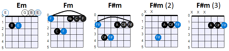 mineurakoorden (je begint op positie 0, daarna): A♯m, Bm, Cm, C♯m, Dm, D♯m, E, F F♯m, G, G♯m,