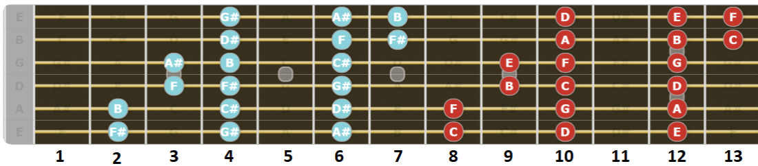 uitstekend voor rocksolo’s. Veel bekende rockgitaristen voegen hier en daar nog wat noten toe aan deze toonladder.