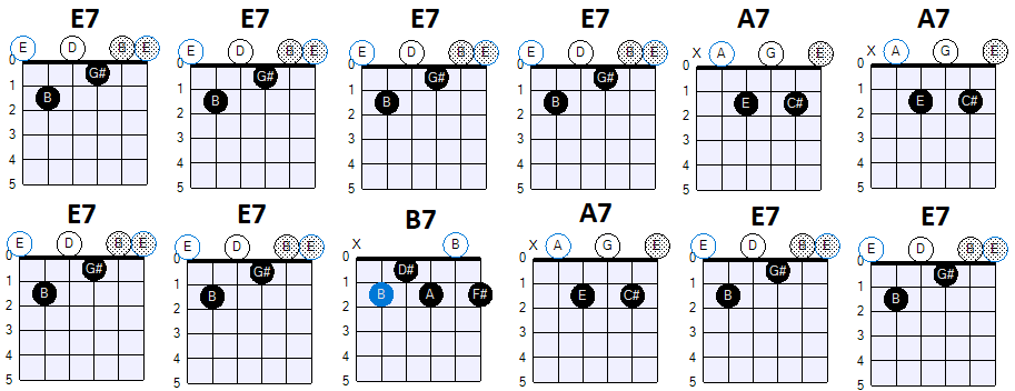 Dit is de klassieke 12-Bar Blues progressie, zoals deze overigens ook in Jazz muziek wordt gebruikt. In de rockmuziek