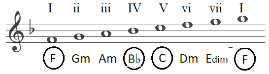 Daarnaast moet je nog weten dat als je de noten vertaald naar akkoorden, een majeur toonladder (in ons geval de F majeur toonladder)