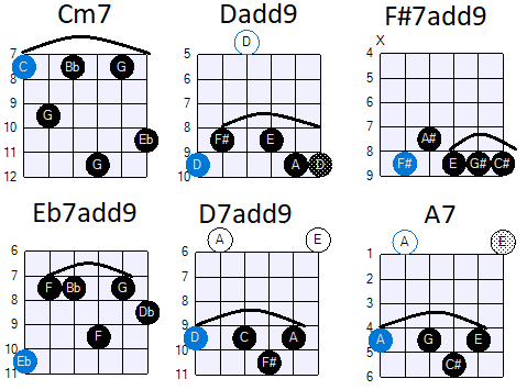 Adim7 akkoord oplevert. Vervolgens speel je een akkoordenschema in F♯ majeur zoals F♯/A♯ B C♯ F♯ .