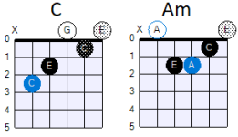 Welke spilakkoorden (gemeenschappelijke akkoorden) zijn er dus tussen de toonsoorten C-majeur en G-majeur? Dat zijn er 4: C, Em, G en Am.