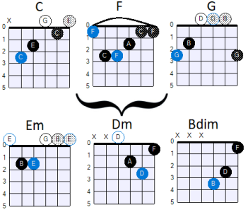 Dus je krijgt in totaal het volgende akkoordenprogressie-schema: C F G C Em C D G.