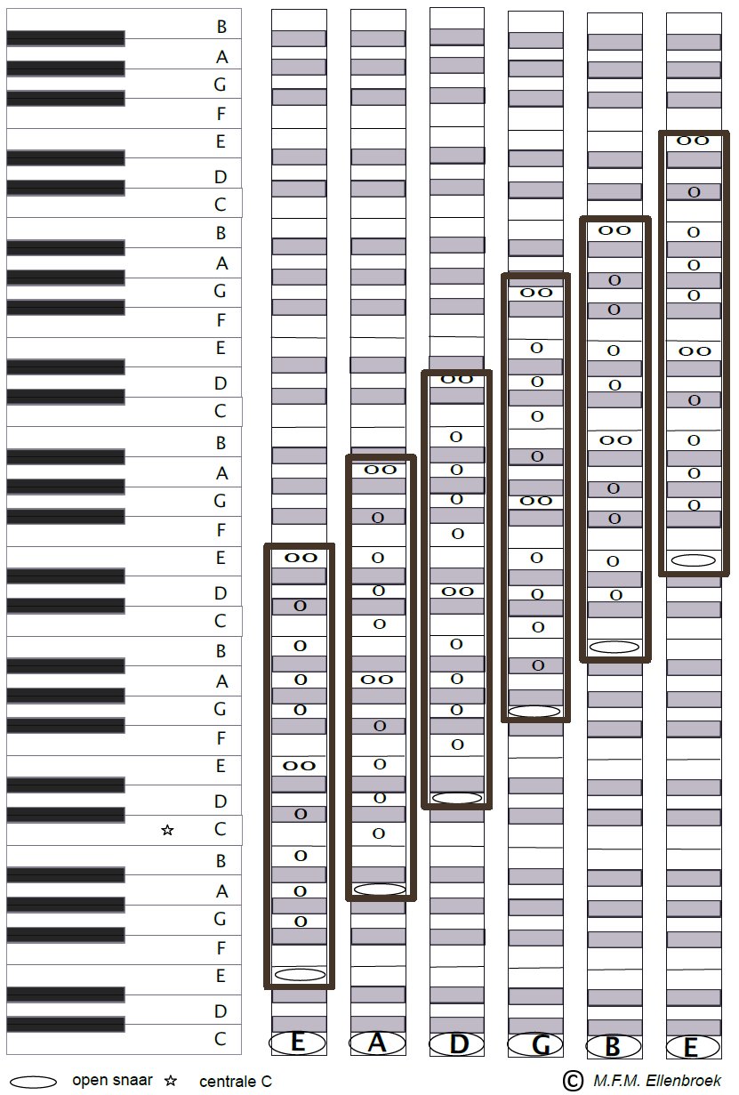 De kolommen "Frets →" en "Frets ←" hebben we in de tabel verwerkt zodat je ziet, hoe de toon