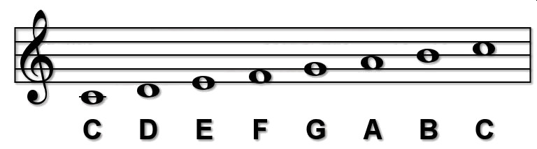 dan heb je een secunde. De afstand van C naar E is drie letters (C – D – E) en heet een terts. Vier letters is een kwart