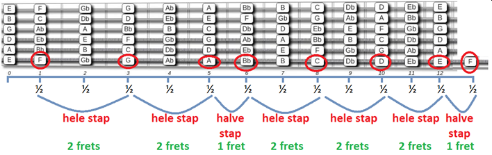 Op je gitaarhals is iedere fret een ½ stap,dus ga je van een C naar een D, dan zit daar volgens het piano toetsenbord een