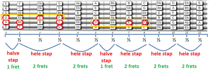Dus: zit je op fret 5 en tel je terug naar fret 4, dan heet de noot op fret 4 een E♭ (Es), tel je van fret 3 naar