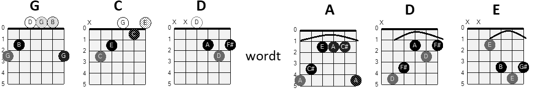 De akkoorden A, D en E klinken dan een octaaf lager, maar hebben precies dezelfde klankkleur als dezelfde akkoorden A, D en E, die met een Capo