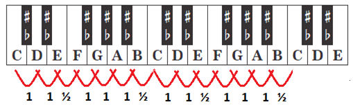 zwarte toets tussen twee tonen zit, bijvoorbeeld van E naar F en van B naar C, dan is er sprake van een ½ stap.