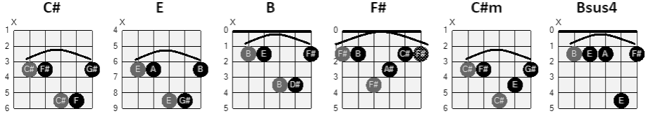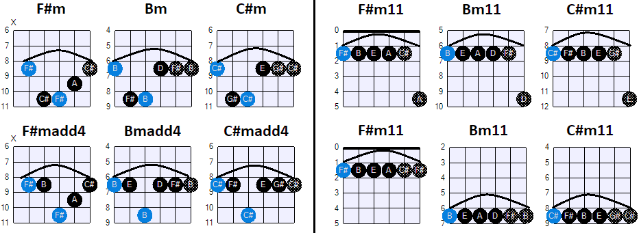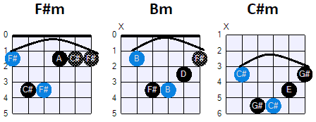 Dat betekent, dat je de akkoordprogressie I - IV - V in F♯ mineur ook op die posities kunt spelen.