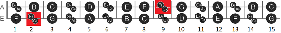 dat er op de A snaar op de 9de positie een F♯ (of G♭) noot staat. Je ziet, dat op de 7de positie van de lage-E snaar een B