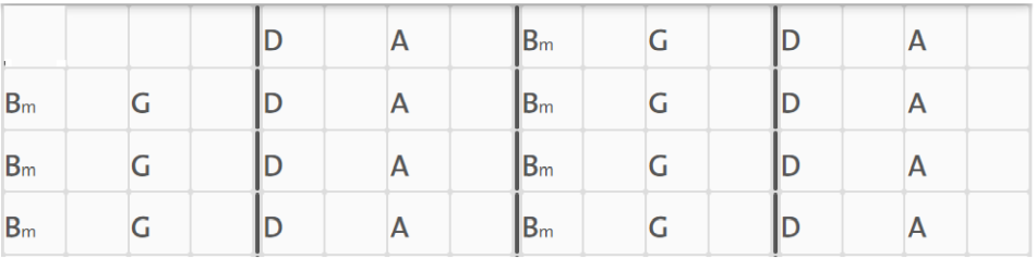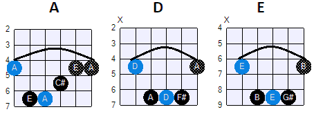 Als we een I - IV - V akkoordprogressie willen spelen, dan hebben we de volgende akkoorden: A, D en E (allen majeur akkoorden), zie de tabel
