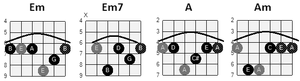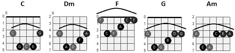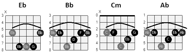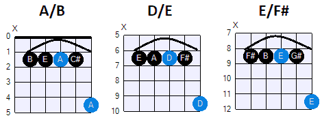 Hiernaast zie je, dat je met één barré Shape, alledrie de akkoorden kunt spelen. Je verschuift alleen maar je