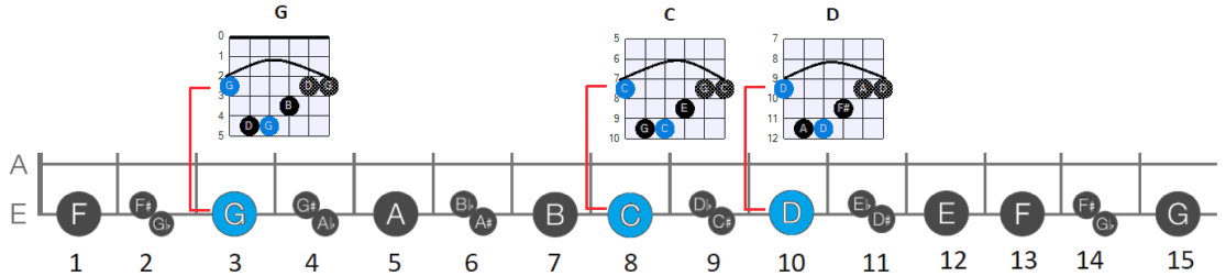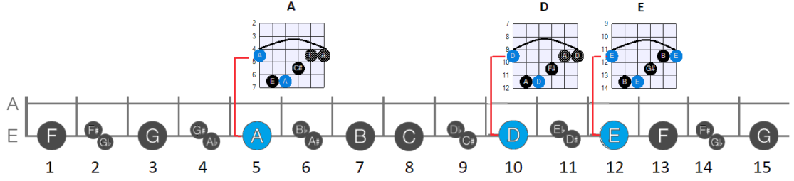 blauw weergegeven in de akkoorddiagrammen), koppelen aan de 6de snaar (de lage-E snaar) van de gitaar. Dat ziet er voor de eerste