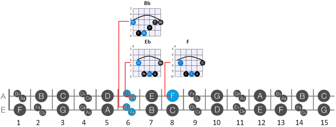 neem je de 6de positie, evenals voor de E♭. De shape om de F te spelen verschuift dan naar de 8ste positie. Dat komt
