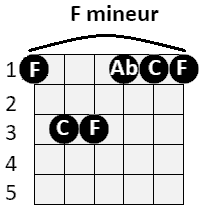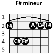 Om de verschuifbare barré akkoorden nog wat verder te verduidelijken, nu een voorbeeld vanuit de F♯ mineur toonladder.