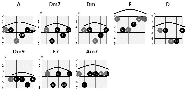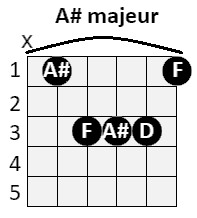 grondtoon van het barré akkoord een A, en die vind je op de 6de snaar terug, op de 5de positie. Zo ook voor de