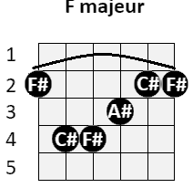 6de snaar en de 5de snaar, weet je waar het F♯/G♭ akkoord gespeeld moet worden, op respectievelijk de