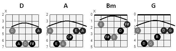Het A majeur akkoord naar het D majeur akkkoord op dezelfde positie van de hals blijft, de 5de fret, maar je moet wel je vingers